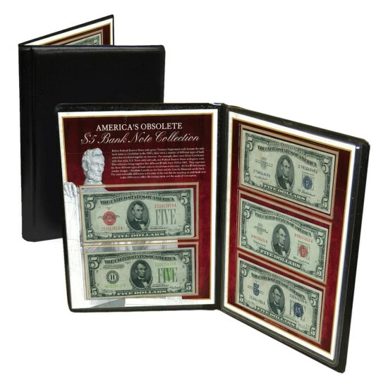 Before Federal Reserve Notes featured only green Treasury Department Seals, there were a number of different notes in America. Collect 5 of these unique notes in this $5 Collection. This grouping represents the three different types of bank notes in circulation from 1928-1963.All five $5 bills feature similar designs – Abraham Lincoln on the front and the Lincoln Memorial on the back. The most noticeable difference is the color of the seal, but the wording on each bank note is also different to reflect the issuing entity and the mode of redemption.