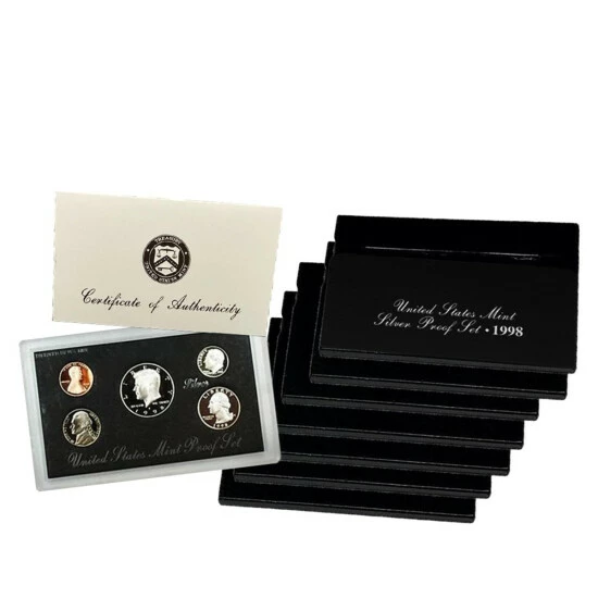 - 1992 – 1998 silver proof sets (total of 35 coins) – Each 5-coin set contains Lincoln cent, Jefferson nickel, Roosevelt dime (silver), Washington quarter (silver)and Kennedy half dollar (silver)