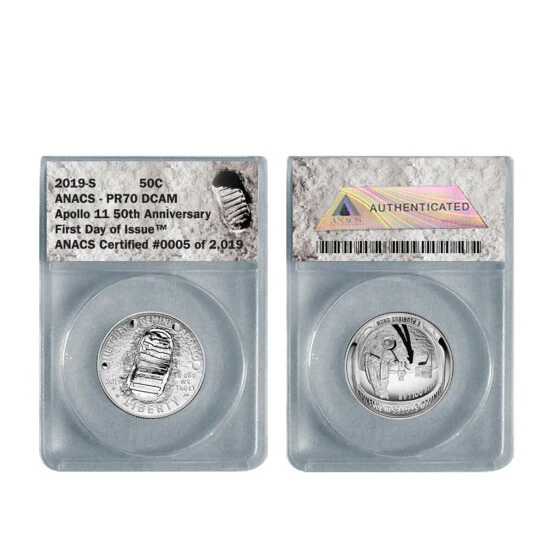 - 2019-S PR70 DCAM FDOI Apollo 11 50th Anniversary dome-shaped clad half dollar