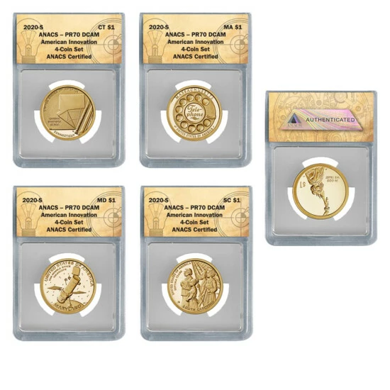 - (4) 2020 PR70 DCAM ANACS San Francisco Mint American Innovation dollar coins (1 each: Connecticut, Massachusetts, Maryland and South Carolina)