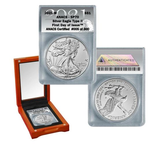 - 2021-W SP70 ANACS Type II silver eagle dollar coin, First Day of Issue; Limited Edition 300