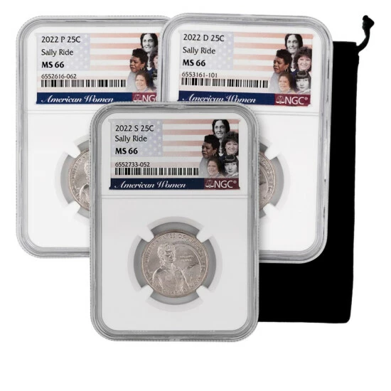 - (3) 2022 MS66 NGCSally RideAmerican Women Quarters; 1 each from Philadelphia, Denver and San Francisco Mints
