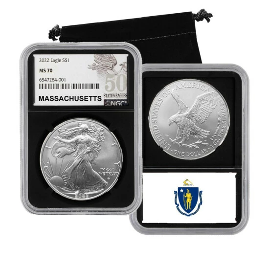 - 2022 MS70 Silver Eagle dollar coin – 50 States Eagles series with Massachusettson labeland Massachusettsflag on reverse