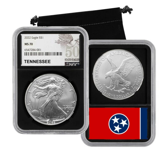 - 2022 MS70 Silver Eagle dollar coin – 50 States Eagles series with Tennessee on labeland Tennessee flag on reverse