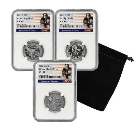 - (3) 2022 MS68 NGC S-Mint American Women quarters; 1 each Maya Angelou, Sally Ride and Wilma Mankiller