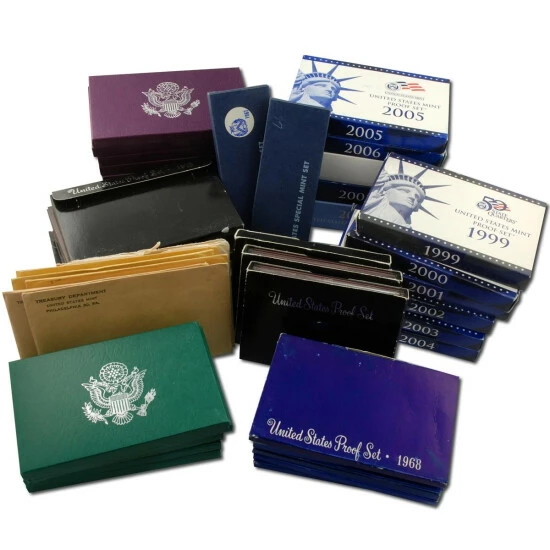 Enjoy the dazzle of proof coins in proof sets. Receive 47 proof sets and 3 mint sets for those years that the United States Mint did not distribute proof sets. All sets are delivered in the original packaging. What a wonderful addition to your collection. Notables include the entire set of state and territorial quarters as well as 3 years of Presidential dollars and the 4 Lincoln Bicentennial cents from 2009. Each proof set would make a wonderful gift to commemorate a special occasion.