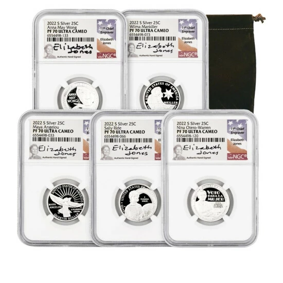 - (5) 2022 PF70 NGC Women Making History Silver Quarters Signed by Chief Engraver Elizabeth Jones, including 1 each: Maya Angelou, Dr. Sally Ride, Wilma Mankiller, Adelina (Nina) Otero-Warren and Anna May Wong